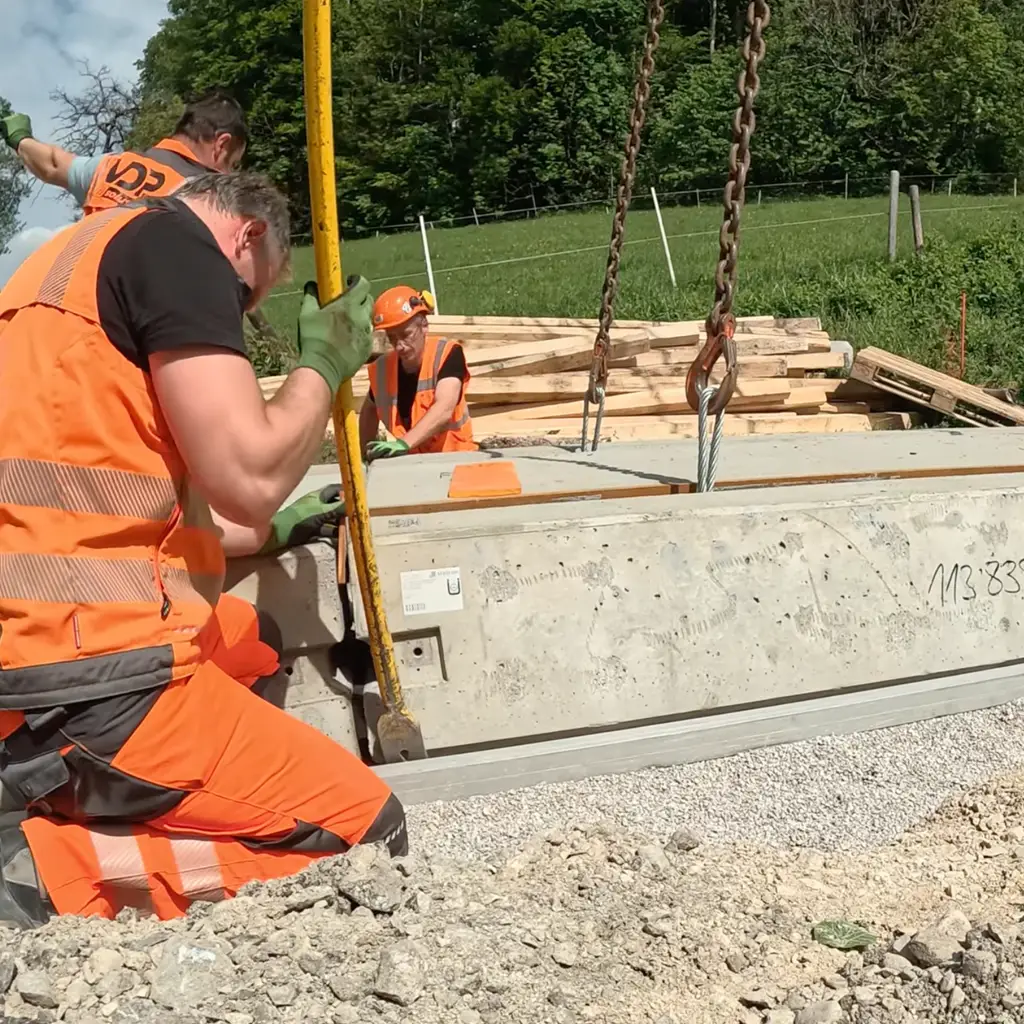 Für Projekte, die besondere konstruktive Anforderungen stellen, bieten wir Hybridplatten an – Betonfertigteile mit bereits integrierten Stahltrögen. Diese Kombination vereint die Vorteile beider Werkstoffe zu einem leistungsstarken Werkstoff. Die benötigten Stahltröge fertigen wir ebenfalls in unserem eigenen Werk. Planung, Stahlbau und Betonfertigung greifen dabei nahtlos ineinander.